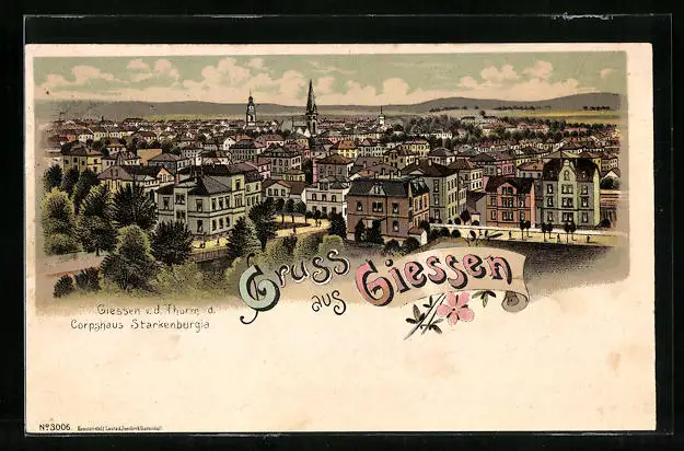 Lithographie Giessen, Totalansicht v. d. Turm d. Corpshaus Starkenburgia