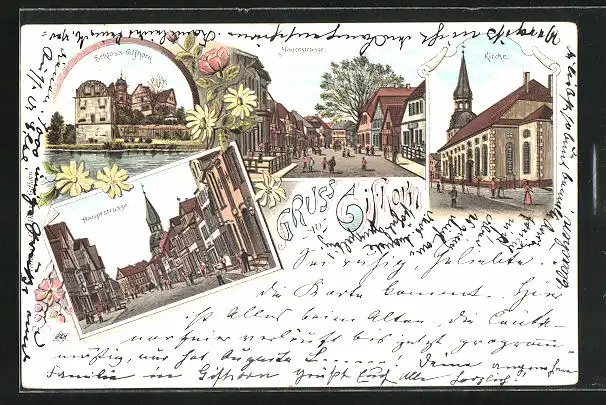 Lithographie Gifhorn, Hauptstrasse, Kirche, Schloss