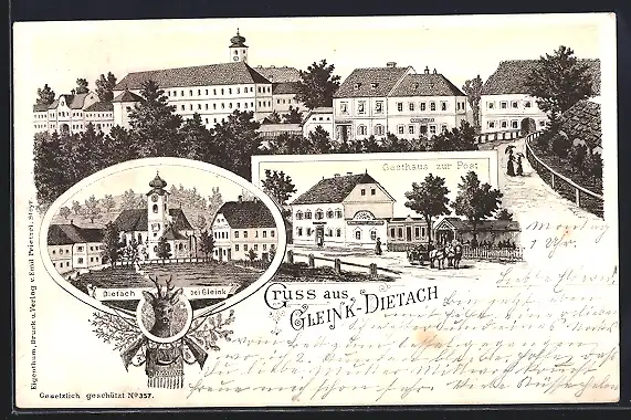 Lithographie Gleink-Dietach, Blick auf Gasthaus zur Post und Kirche in Dietach