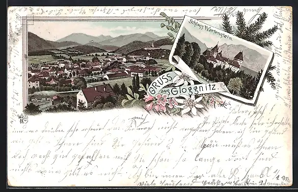 Lithographie Gloggnitz, Schloss Wartenstein, Totalansicht