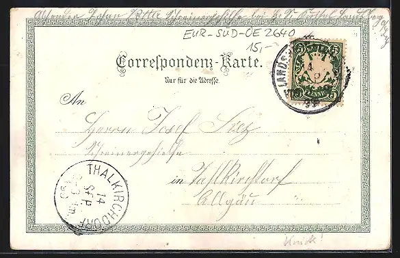 Personenbezogene Daten auf der Rückseite der Karte wurden durch blauen Textmarker unkenntlich gemacht. Die blauen Stellen sind auf die Vorderseite durchgeweicht und wirken sich negativ auf das Postkartenfoto aus