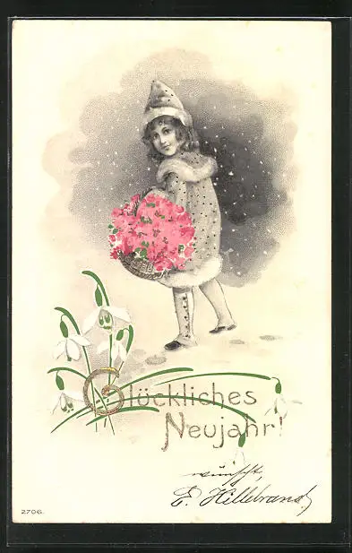 Lithographie Glückliches Neujahr!, Mädchen im Schneegestöber mit Blumenkorb