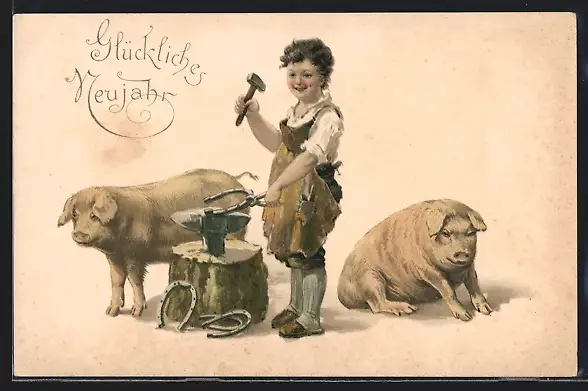 Lithographie Glückliches Neujahr, kleiner Schmied und Schweine