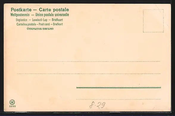 Personenbezogene Daten auf der Rückseite der Karte wurden durch blauen Textmarker unkenntlich gemacht. Die blauen Stellen sind auf die Vorderseite durchgeweicht und wirken sich negativ auf das Postkartenfoto aus