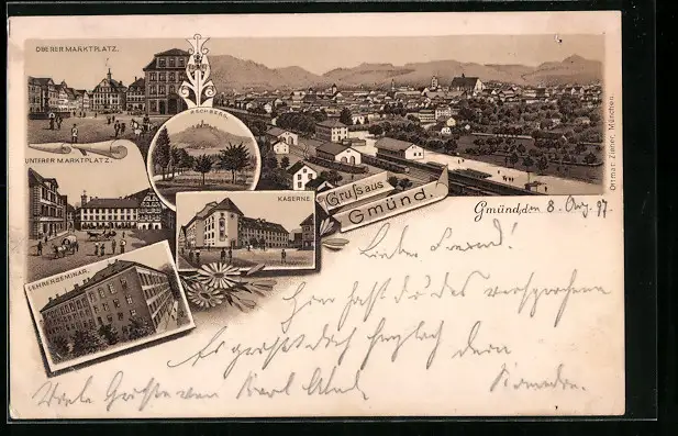 Lithographie Gmünd, Kaserne, Lehrerseminar, Rechberg