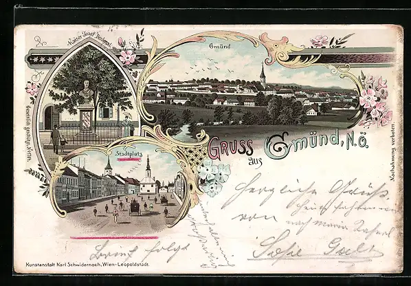 Lithographie Gmünd, Totalansicht, Kaiser Josef-Denkmal, Stadtplatz