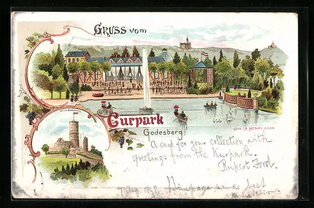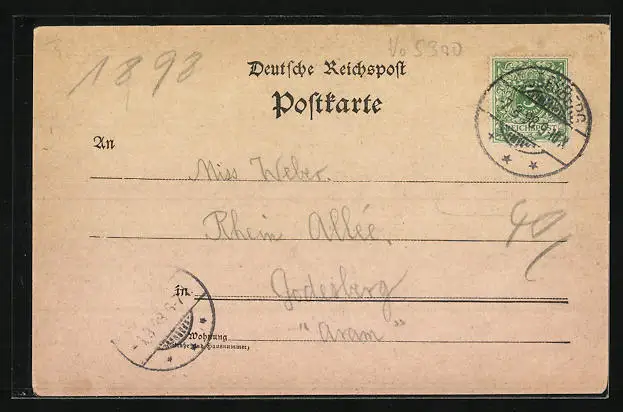Personenbezogene Daten auf der Rückseite der Karte wurden durch blauen Textmarker unkenntlich gemacht. Die blauen Stellen sind auf die Vorderseite durchgeweicht und wirken sich negativ auf das Postkartenfoto aus