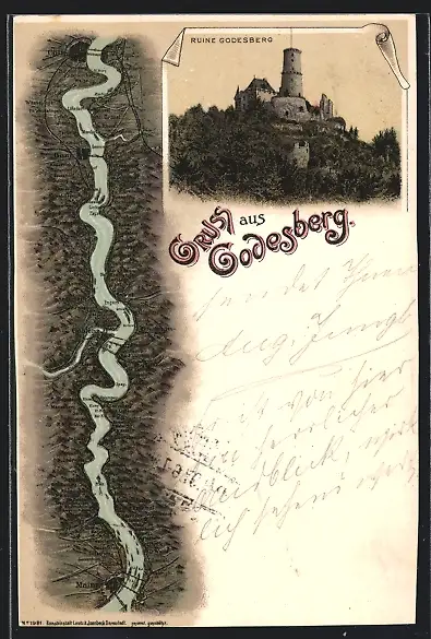Lithographie Godesberg, Ruine Godesberg, Rheintal von Mainz bis Köln