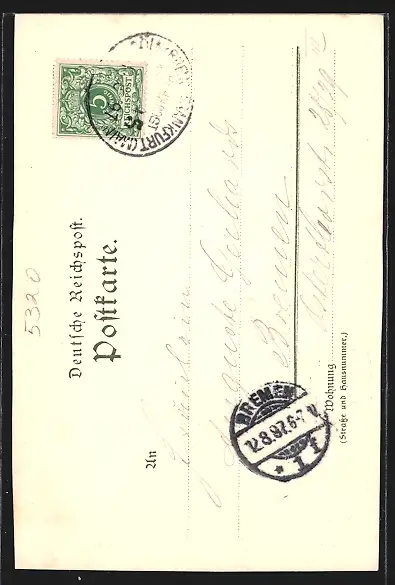 Personenbezogene Daten auf der Rückseite der Karte wurden durch blauen Textmarker unkenntlich gemacht. Die blauen Stellen sind auf die Vorderseite durchgeweicht und wirken sich negativ auf das Postkartenfoto aus