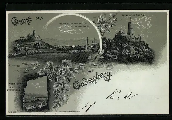 Lithographie Godesberg, Ruine und Siebengebirge, Aussicht v. d. Ruine