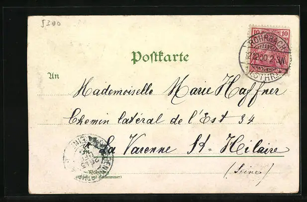 Personenbezogene Daten auf der Rückseite der Karte wurden durch blauen Textmarker unkenntlich gemacht. Die blauen Stellen sind auf die Vorderseite durchgeweicht und wirken sich negativ auf das Postkartenfoto aus