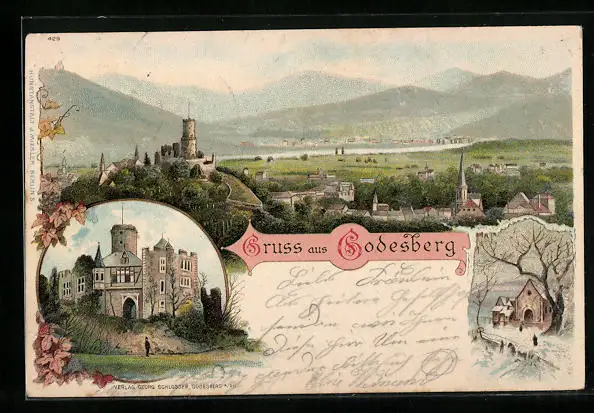 Lithographie Godesberg, Totalansicht mit Ruine