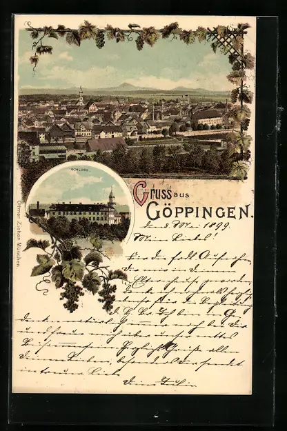 Lithographie Göppingen, Schloss, Blick über die Stadt