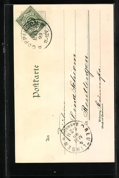 Personenbezogene Daten auf der Rückseite der Karte wurden durch blauen Textmarker unkenntlich gemacht. Die blauen Stellen sind auf die Vorderseite durchgeweicht und wirken sich negativ auf das Postkartenfoto aus