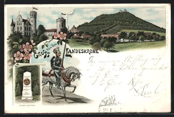Lithographie Görlitz, Gasthaus Landeskrone, Körner Denkmal
