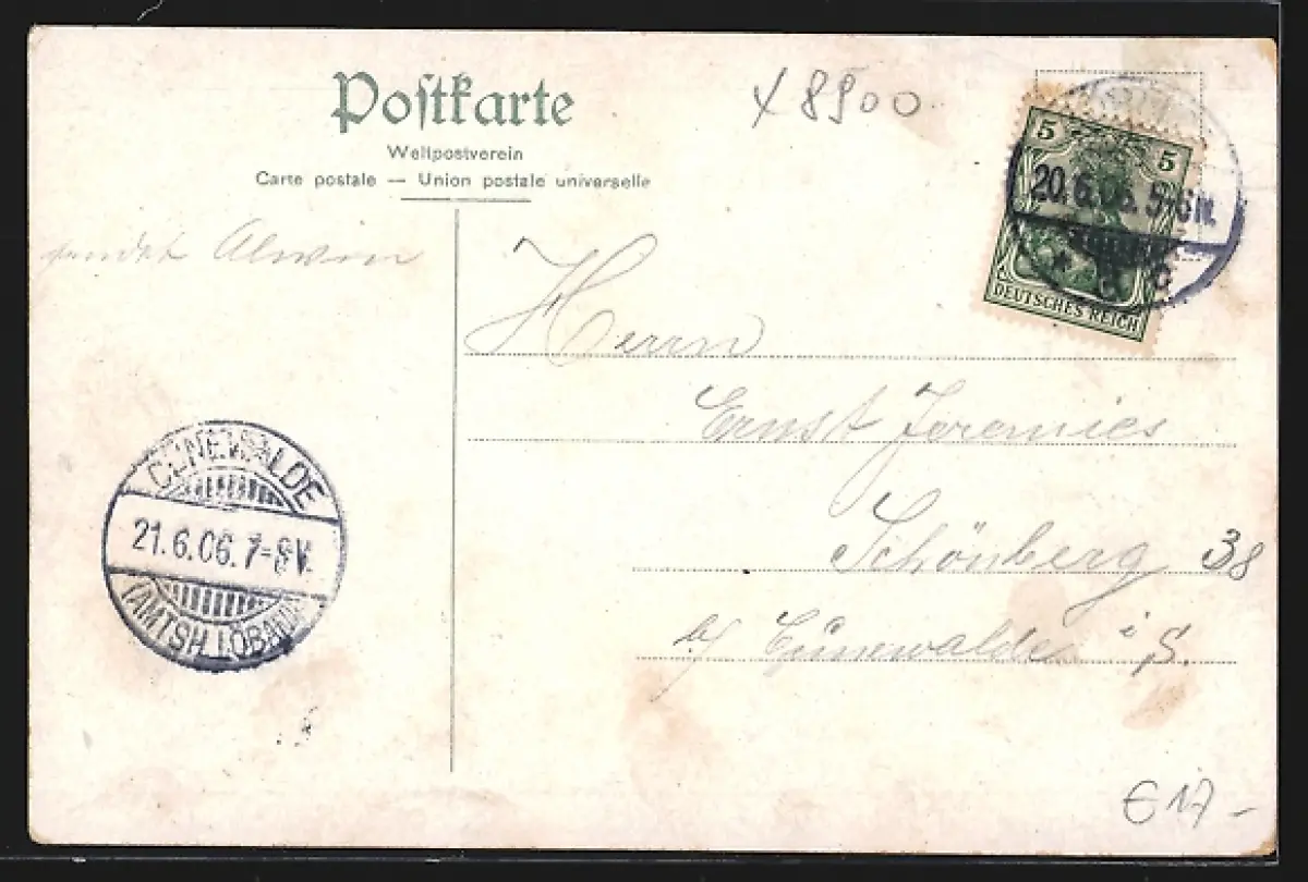 Personenbezogene Daten auf der Rückseite der Karte wurden durch blauen Textmarker unkenntlich gemacht. Die blauen Stellen sind auf die Vorderseite durchgeweicht und wirken sich negativ auf das Postkartenfoto aus