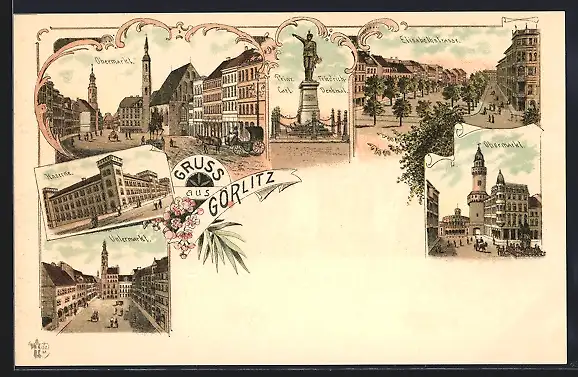 Lithographie Görlitz, Kaserne, Obermarkt, Elisabethstrasse