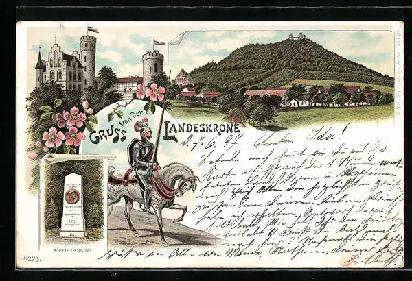 Lithographie Görlitz, Landeskrone mit Körner Denkmal