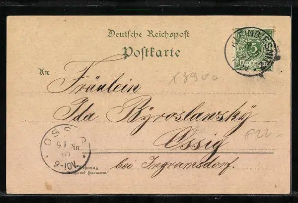 Personenbezogene Daten auf der Rückseite der Karte wurden durch blauen Textmarker unkenntlich gemacht. Die blauen Stellen sind auf die Vorderseite durchgeweicht und wirken sich negativ auf das Postkartenfoto aus