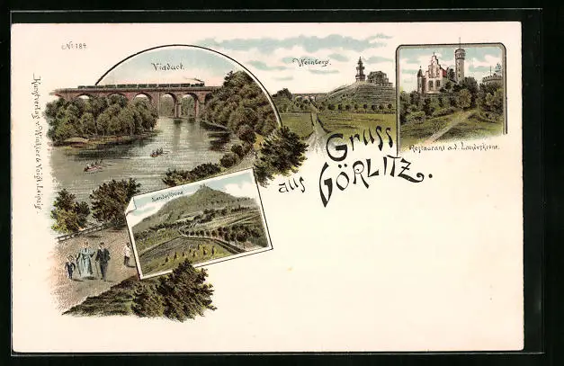 Lithographie Görlitz, Restaurant a. d. Landeskrone, Weinberg, Viaduct