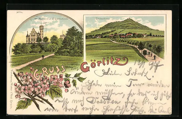 Lithographie Görlitz, Restauration auf der Landeskrone, Ortsansicht mit Landeskrone