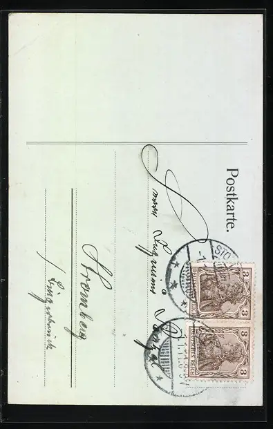 Personenbezogene Daten auf der Rückseite der Karte wurden durch blauen Textmarker unkenntlich gemacht. Die blauen Stellen sind auf die Vorderseite durchgeweicht und wirken sich negativ auf das Postkartenfoto aus