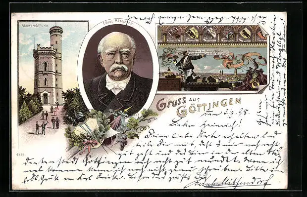 Lithographie Göttingen, Bismarckturm mit Porträt Fürst Bismarck