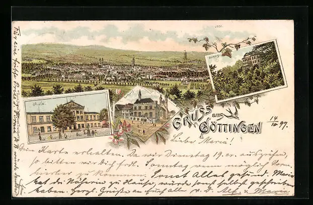Lithographie Göttingen, Gasthaus Rohns, Aula, Ansicht vom Rathaus
