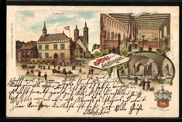 Lithographie Göttingen, Ortsansicht mit Rathaus und Ratskeller