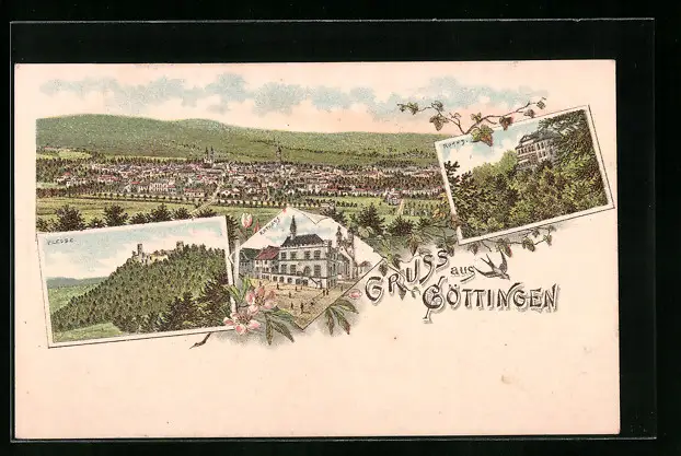 Lithographie Göttingen, Panorama, Rathaus, Plesse