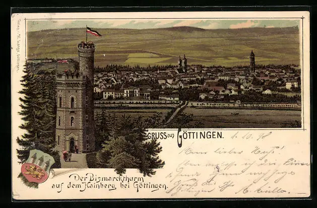 Lithographie Göttingen, Panorama der Stadt mit Bismarckthurm und Wappen
