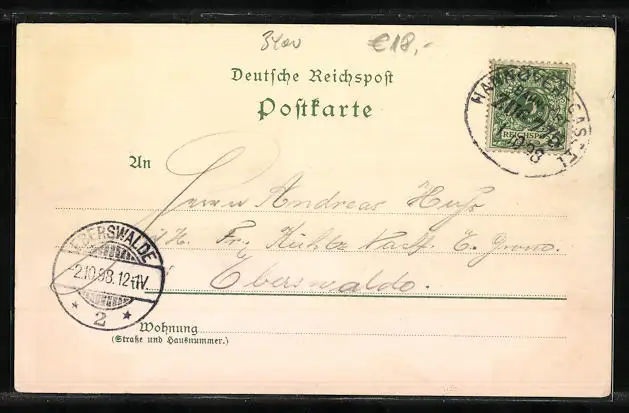 Personenbezogene Daten auf der Rückseite der Karte wurden durch blauen Textmarker unkenntlich gemacht. Die blauen Stellen sind auf die Vorderseite durchgeweicht und wirken sich negativ auf das Postkartenfoto aus