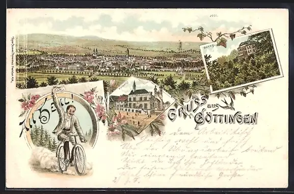 Lithographie Göttingen, Rathaus, Rohns, Radfahrer