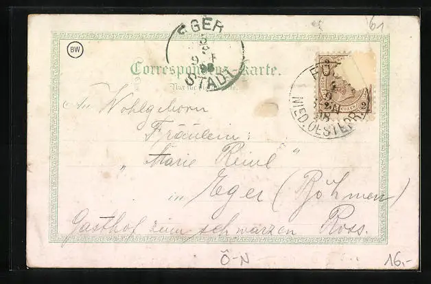 gelaufen 1898, Briefmarke beschädtigt, rückseitig Oberflächenschaden, Bugspur oben li., guter Zustand