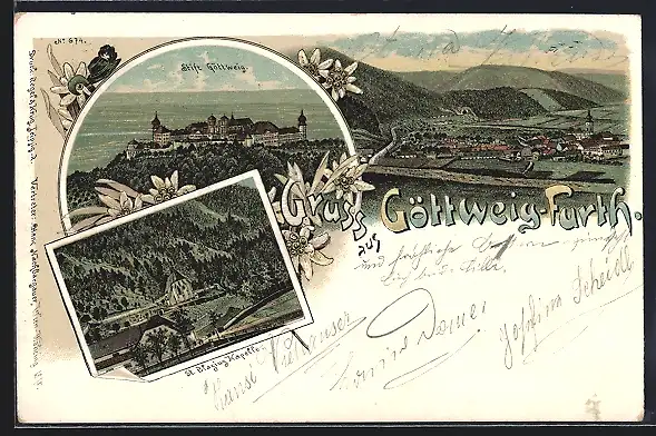 Lithographie Göttweig-Furth, Teilansicht, Stift Göttweig, St. Blasius-Kapelle