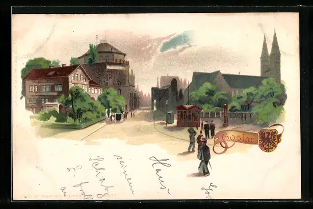 Lithographie Goslar, Strassenpartie mit Kiosk