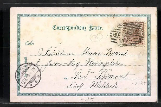 Personenbezogene Daten auf der Rückseite der Karte wurden durch blauen Textmarker unkenntlich gemacht. Die blauen Stellen sind auf die Vorderseite durchgeweicht und wirken sich negativ auf das Postkartenfoto aus