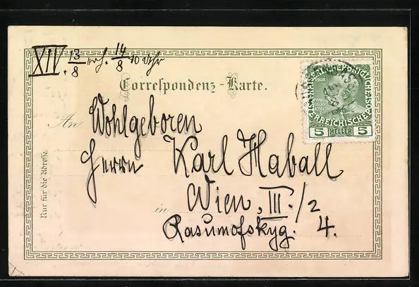 Personenbezogene Daten auf der Rückseite der Karte wurden durch blauen Textmarker unkenntlich gemacht. Die blauen Stellen sind auf die Vorderseite durchgeweicht und wirken sich negativ auf das Postkartenfoto aus