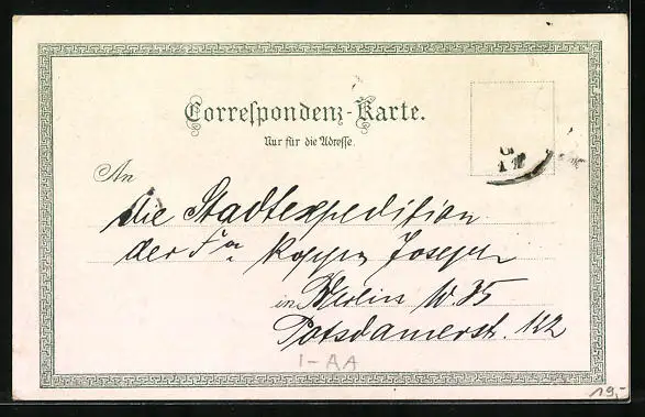 Personenbezogene Daten auf der Rückseite der Karte wurden durch blauen Textmarker unkenntlich gemacht. Die blauen Stellen sind auf die Vorderseite durchgeweicht und wirken sich negativ auf das Postkartenfoto aus