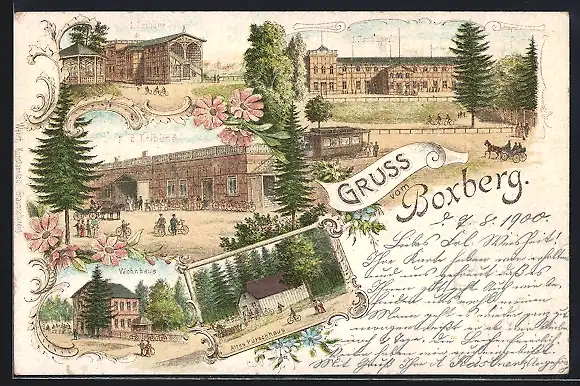 Lithographie Gotha, Pferderennbahn &b Gasthaus Boxberg, Tribüne, Altes Pürschhaus