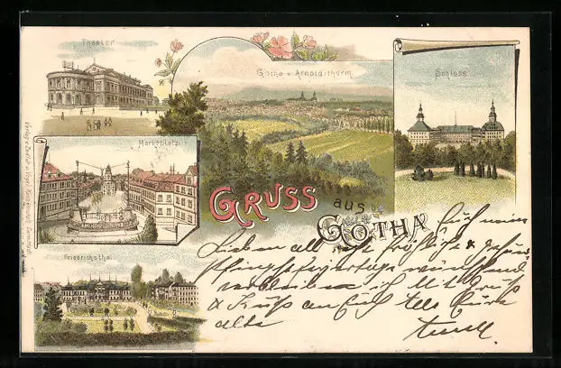 Lithographie Gotha, Theater, Marktplatz, Friedrichsthal