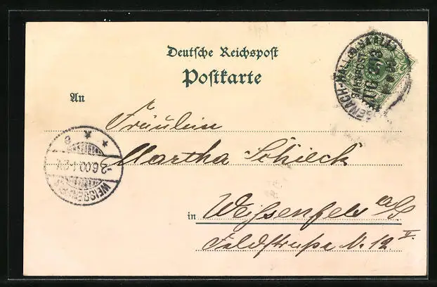 Personenbezogene Daten auf der Rückseite der Karte wurden durch blauen Textmarker unkenntlich gemacht. Die blauen Stellen sind auf die Vorderseite durchgeweicht und wirken sich negativ auf das Postkartenfoto aus
