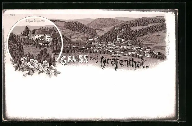 Lithographie Gräfenthal /Thür., Totalansicht, Schloss Wespenstein