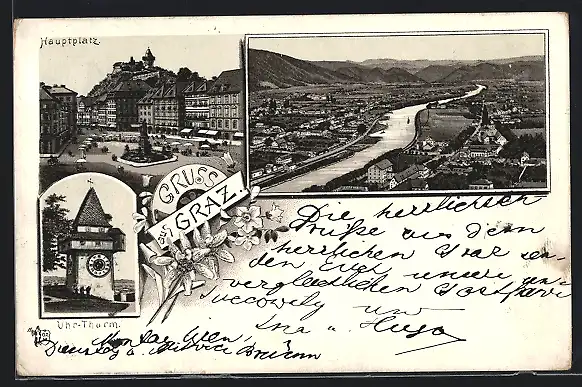 Lithographie Graz, Hauptplatz mit Denkmal, Uhrturm, Ortsansicht