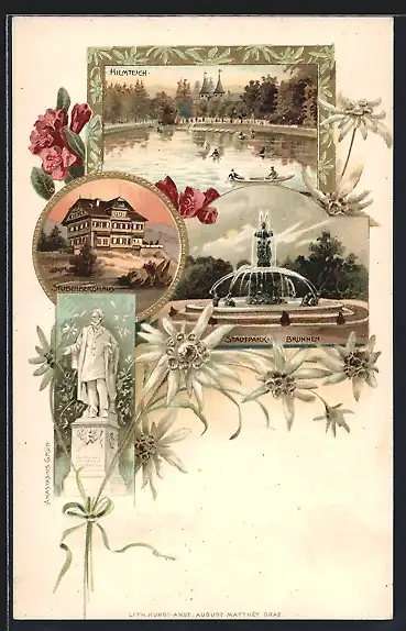 Lithographie Graz, Hilmteich, Stubenberghaus, Stadtpark-Brunnen
