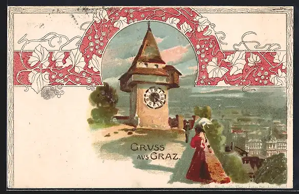 Lithographie Graz, Ortsansicht mit Uhrturm