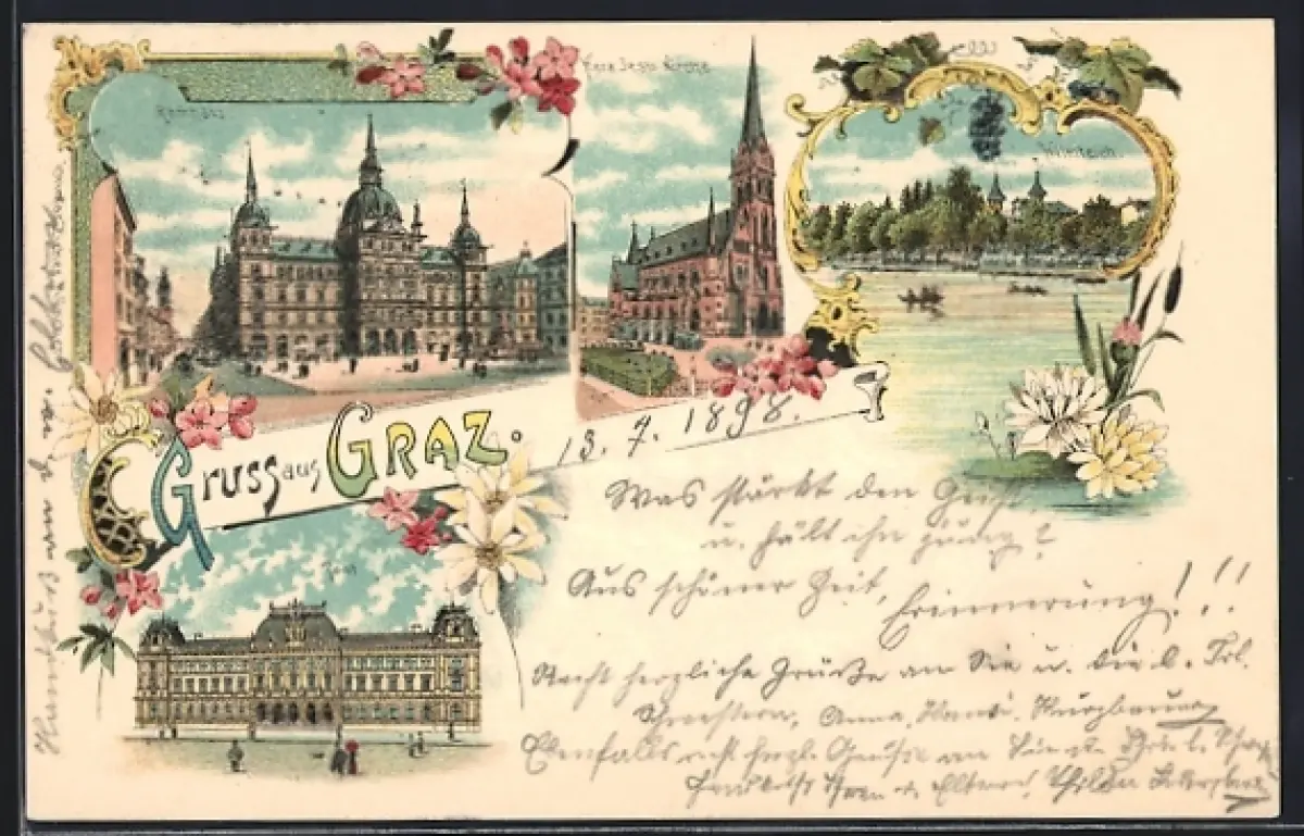 Lithographie Graz, Rathaus, Post, Herz-Jesu-Kirche