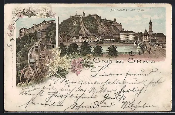 Lithographie Graz, Schlossbergbahn, Totalansicht