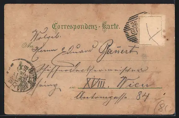 Personenbezogene Daten auf der Rückseite der Karte wurden durch blauen Textmarker unkenntlich gemacht. Die blauen Stellen sind auf die Vorderseite durchgeweicht und wirken sich negativ auf das Postkartenfoto aus