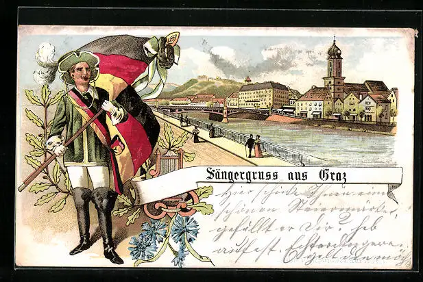 Lithographie Graz, Uferpartie, Sänger mit Fahne